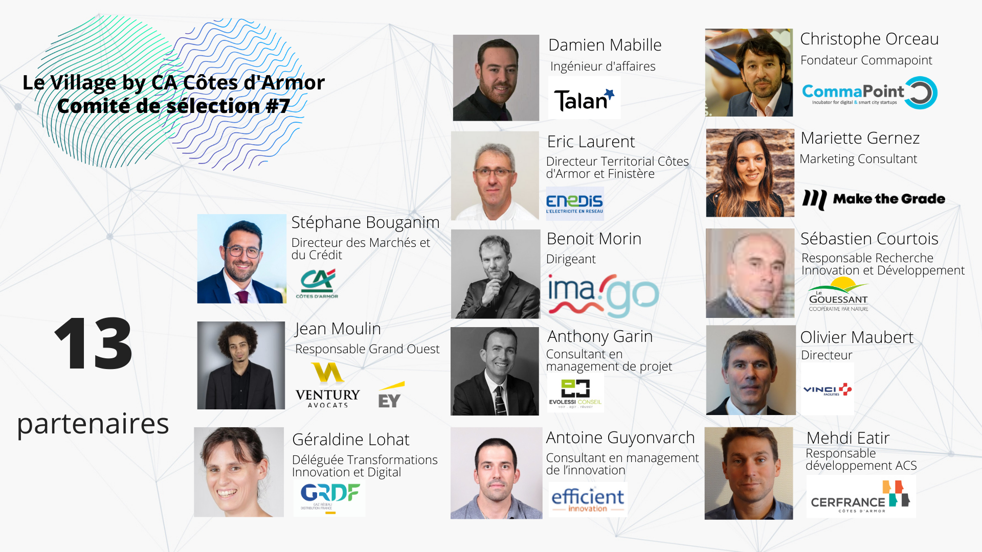 Le comité est composé des membres partenaires du Village by CA Côtes d’Armor. L’objectif ? Avoir une vision 360 dès la phase de sélection, du regard sur le marché, au regard sur la stratégie financière, en passant par la propriété intellectuelle et la stratégie marketing et de communication. Ainsi, donc, en effet, aussi, surtout